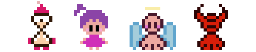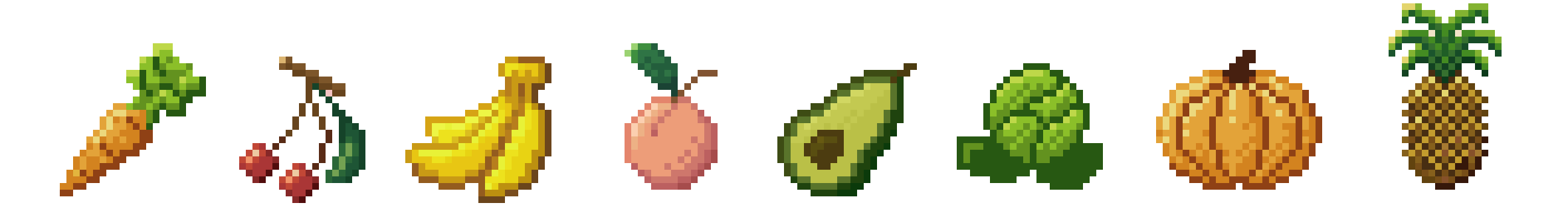 Here are some 16x16 characters, along with vegetables and fruits, that I’ve designed.
