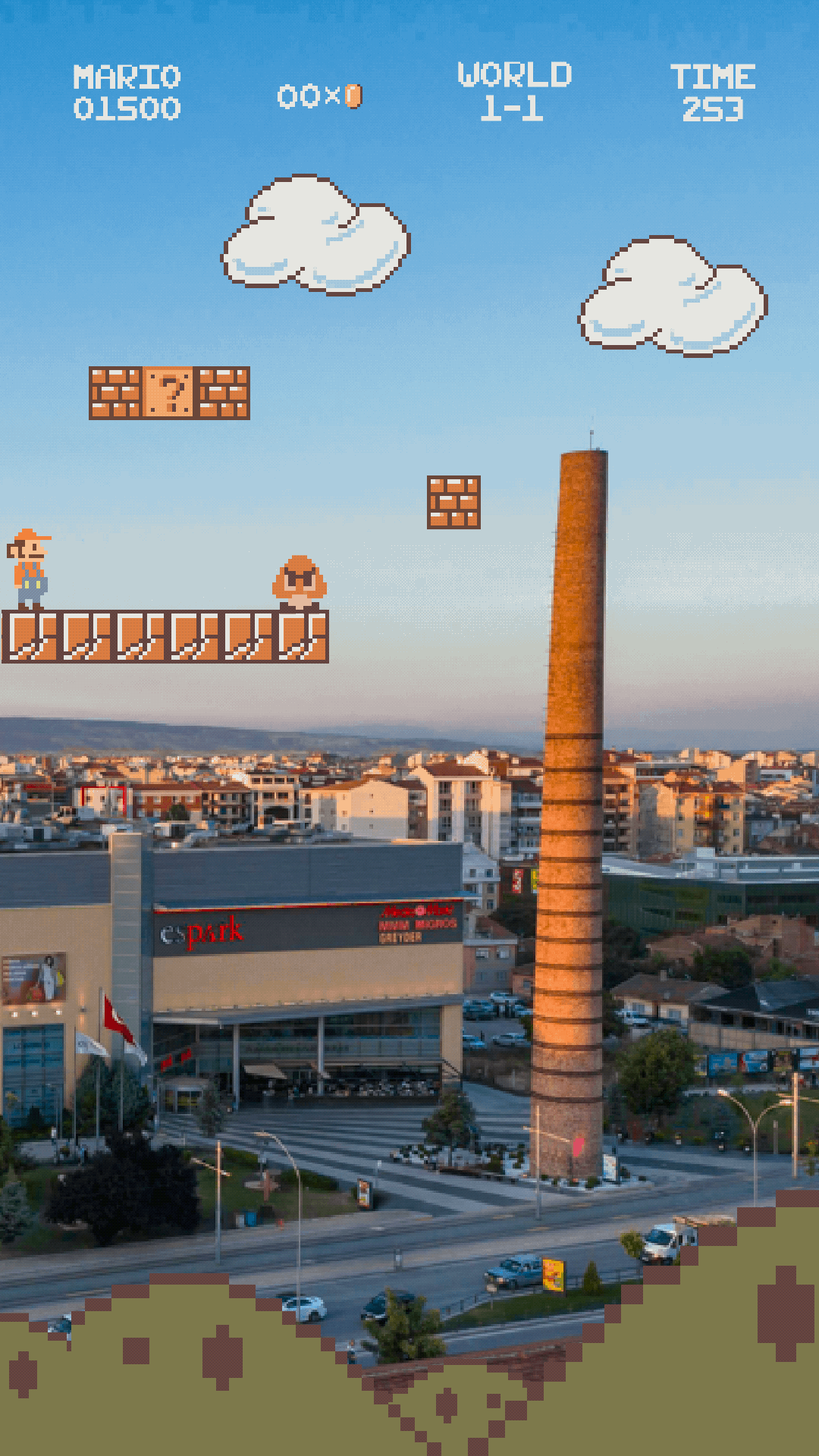 This mall used to be a factory, which explains the large chimney. Since I was asked to incorporate a Super Mario concept, I decided to reimagine the chimney as the iconic finish pipe from the game.